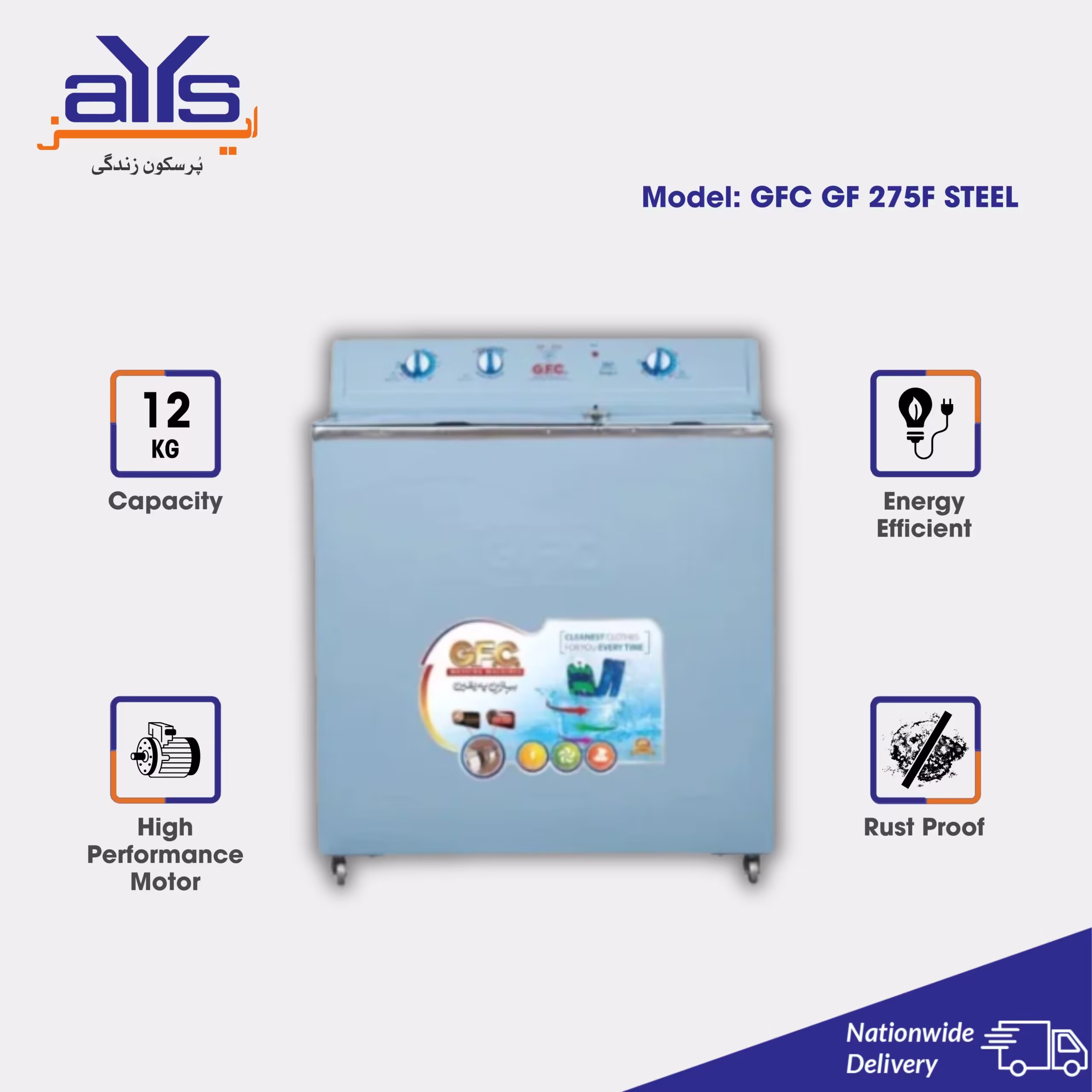 Meet the unwavering strength of steel with the GFC Washing Machine GF-275F Steel. Designed for households that refuse to compromise on durability, this 12 Kg powerhouse features a body built from rust-proof steel, engineered to withstand the test of time and environment. Its high-performance motor delivers a deep, vigorous clean for the largest loads, from daily family laundry to heavy linens. Combining brute strength with simple operation, this washer is the definitive solution for anyone seeking a reliable, long-term laundry partner. Discover the resilient value offered by the latest GFC Washing Machine GF-275F Steel price in Pakistan at AYS Online.